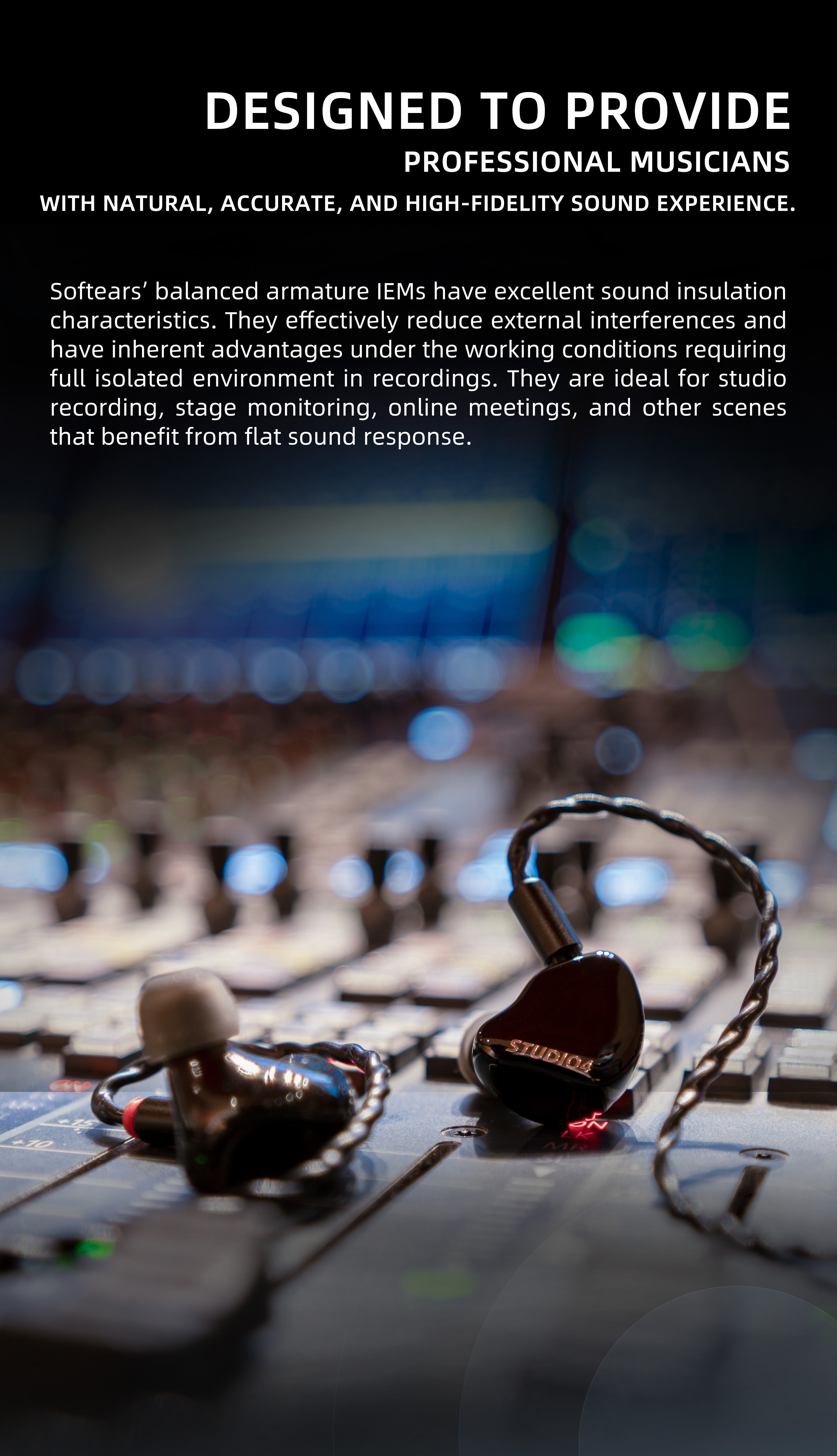 Softears’ balanced armature IEMs have excellent sound insulation characteristics. They effectively reduce external interferences and have inherent advantages under the working conditions requiring full isolated environment in recordings. They are ideal for studio recording, stage monitoring, online meetings, and other scenes that benefit from the flat sound response.