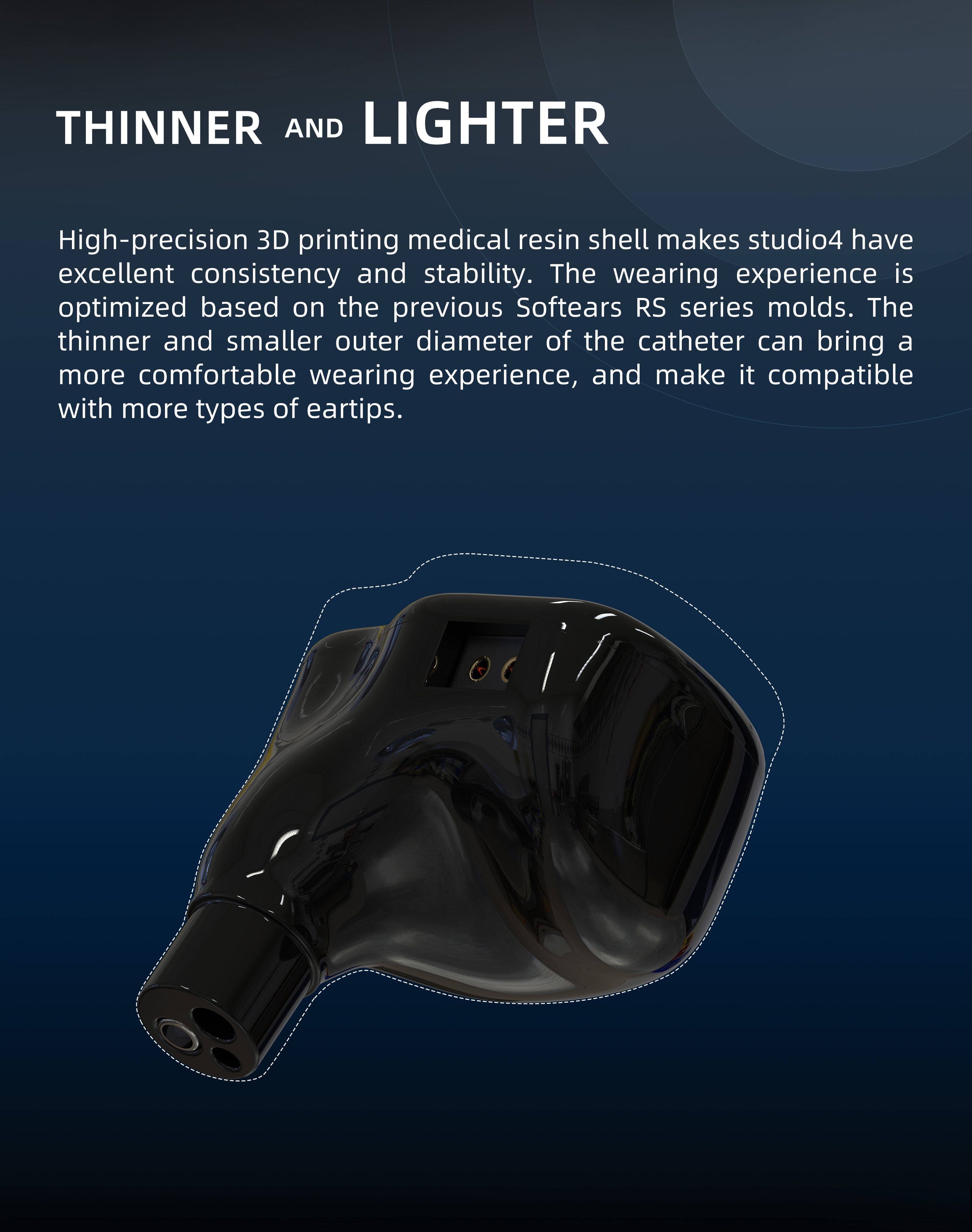 High-precision 3D printing medical resin shell makes studio4 have excellent consistency and stability. The wearing experience is optimized based on the previous Softears RS series molds. The thinner and smaller outer diameter of the catheter can bring a more comfortable wearing experience, and make it compatible with more types of eartips.