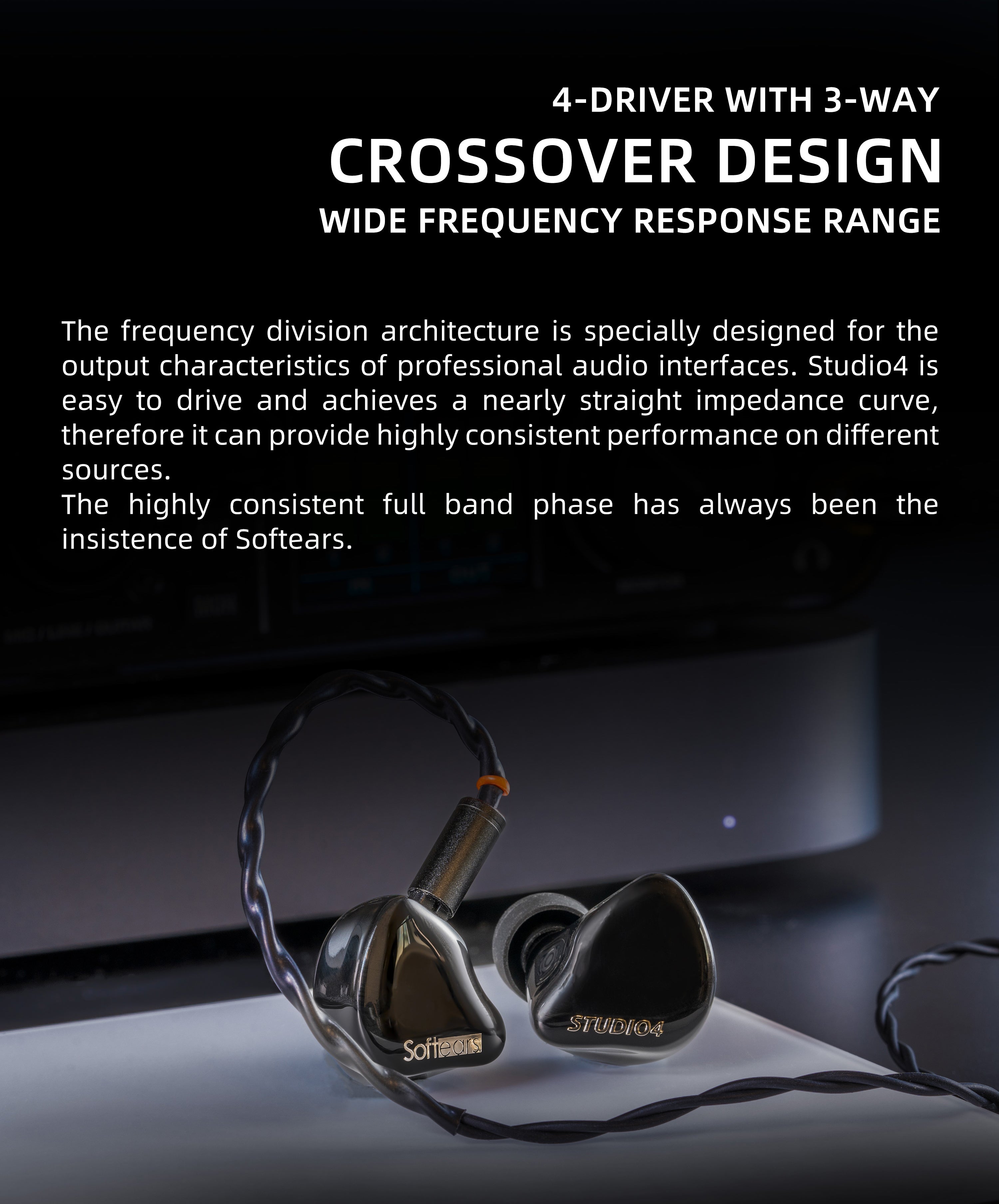The frequency division architecture is specially designed for the output characteristics of professional audio interfaces. Studio4 in-ear monitor is easy to drive and achieves a nearly straight impedance curve, therefore it can provide highly consistent performance on different sources.