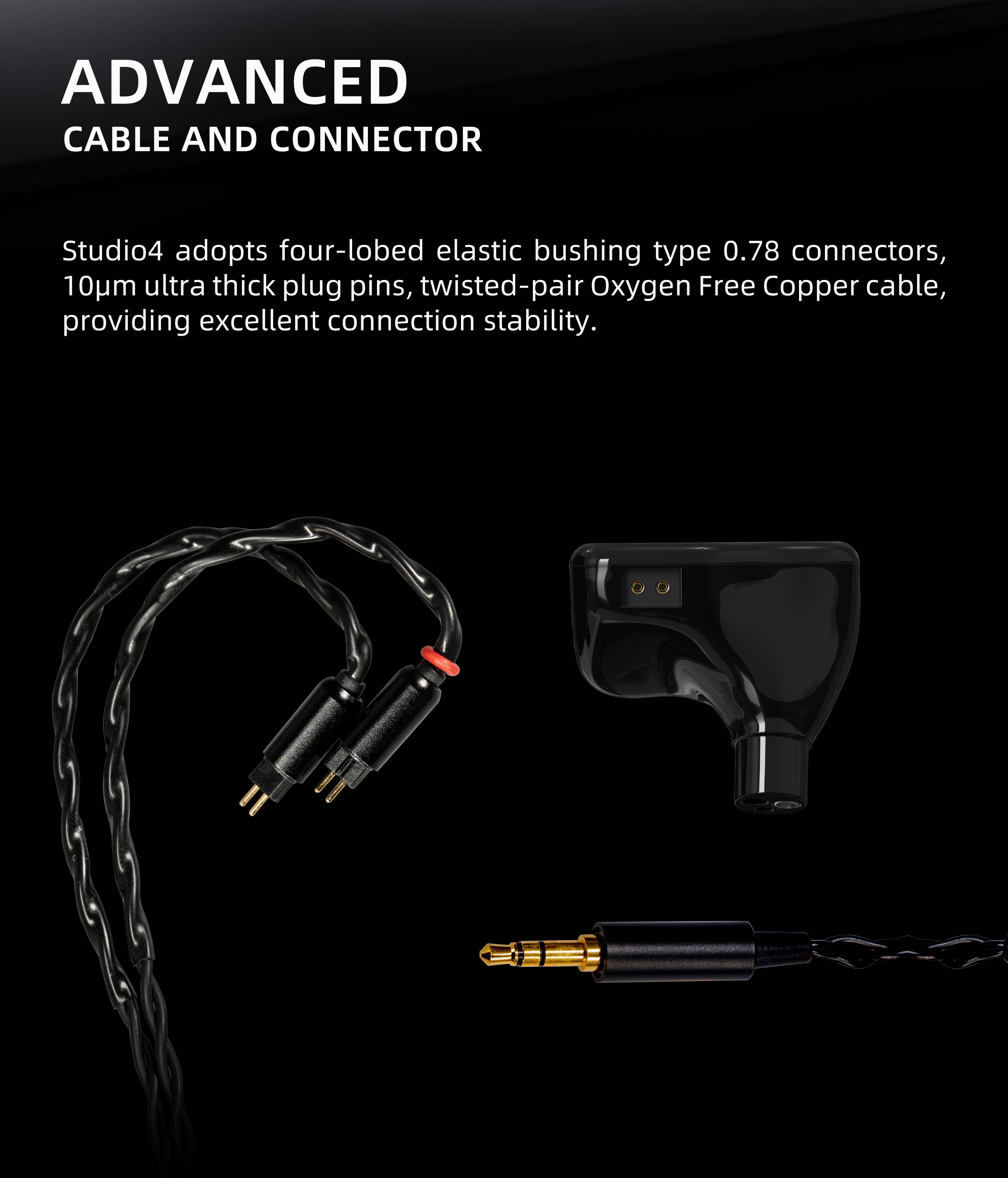 Studio4 adopts four-lobed elastic bushing type 0.78 connectors, 10μm ultra thick plug pins, twisted-pair Oxygen Free Copper cable, providing excellent connection stability.