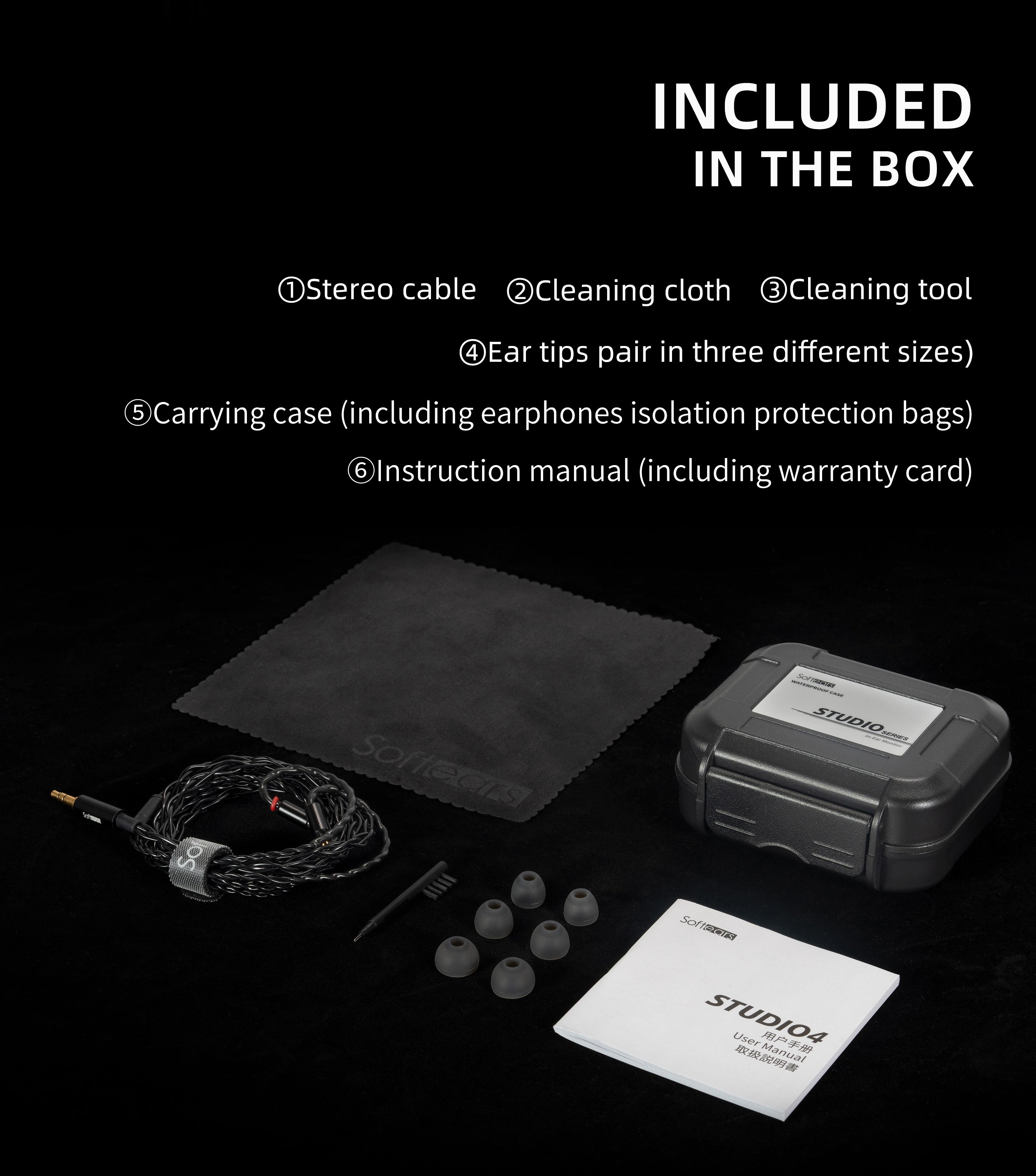 ①Stereo cable ②Cleaning cloth ③Cleaning tool ④Ear tips pair in three different sizes) ⑤Carrying case (including earphones isolation protection bags) ⑥Instruction manual (including warranty card)